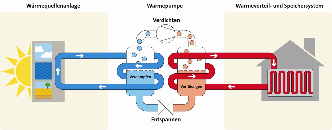 Wärmepumpen arbeiten nach einem physikalischen Prinzip, das bei allen Pumpen dieser Art – unabhängig ihrer Wärmequellen – gleich ist: In einer Wärmepumpe wird ein Kältemittel laufend komprimiert und ausgedehnt, oder anders verdampft und wieder verflüssigt. Es wird also so verändert, dass es mehr Wärme abgibt, als es aufgenommen hat. Das Kältemittel übernimmt die Aufgabe, die Wärme zu übertragen und zu transportieren. Wärmepumpen entziehen einer natürlichen Wärmequelle Wärme, um diese für die Heizanlage im Haus zur Verfügung zu stellen.